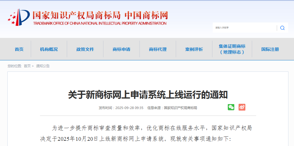 为进一步提升商标审查质量和效率,优化商标在线服务水平,国家知识产权局决定于2025年10月20日上线新商标网上申请系统。现就有关事项通知如下: